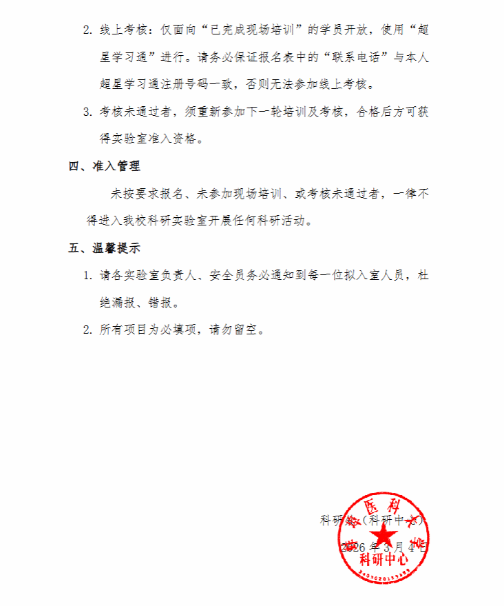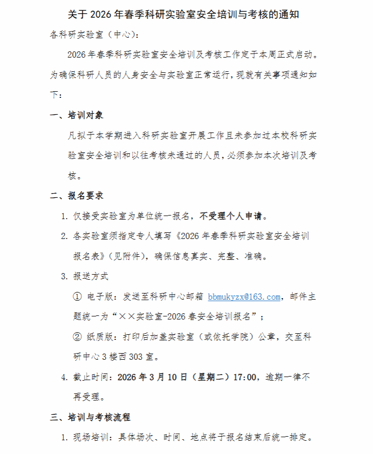 关于2026年春季科研实验室安全培训与考核的通知